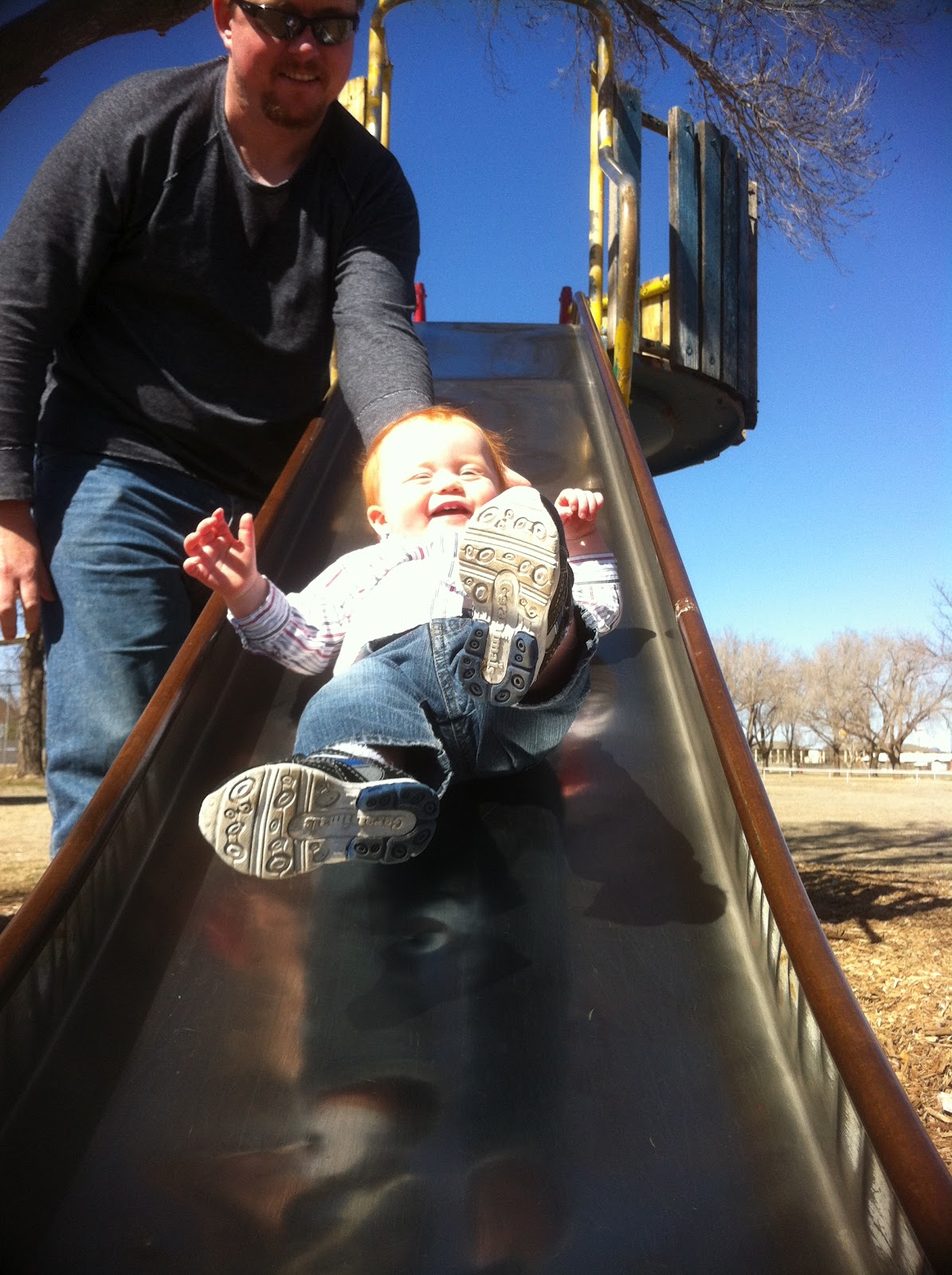 Epic Fail #5- Not realizing that maybe we weren’t quite ready for the big kid slide. We were at the park playing and seeing as he mastered sitting quite some time ago and is walking pretty well, we thought he could certainly sit upright while sliding down the big kid slide. Well, go figure, as soon as Daddy took his hand off E’s back, he went straight to his back and then managed to turn so that by the time he got down to me, he bonked his forehead off the edge of the slide. And then the tears flowed. Ok, so we weren’tquite ready for the big kid slide.