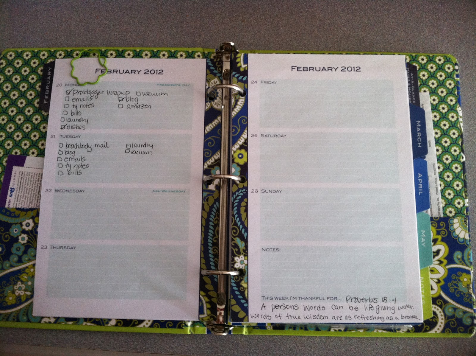 And I LOVE my Vera planner. I use it mainly for my to do list and the calendar. I have another planner that I use for my blogging to do list. And I have a calendar up on the office wall with workouts scheduled. So I kinda spread it out a little. I know when I have more kids though, I will have to upgrade to a bigger planner!